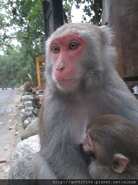 帶著一隻小猴子的年輕母猴,牠不怕生、也最得人疼,