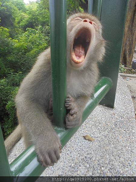 一付威風凜凜,「正義魔人」的模樣,在步道上驅趕猴子。